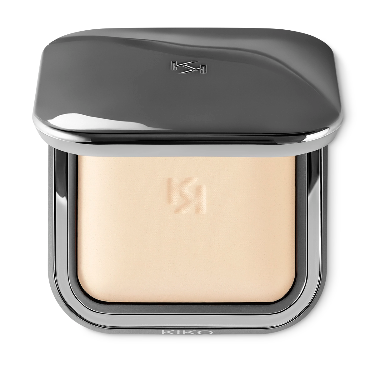 Пудреница бронзового цвета с магнитным замком и встроенным зеркальцем выполнена в современном дизайне с выгравированным логотипом «KK» на крышке.